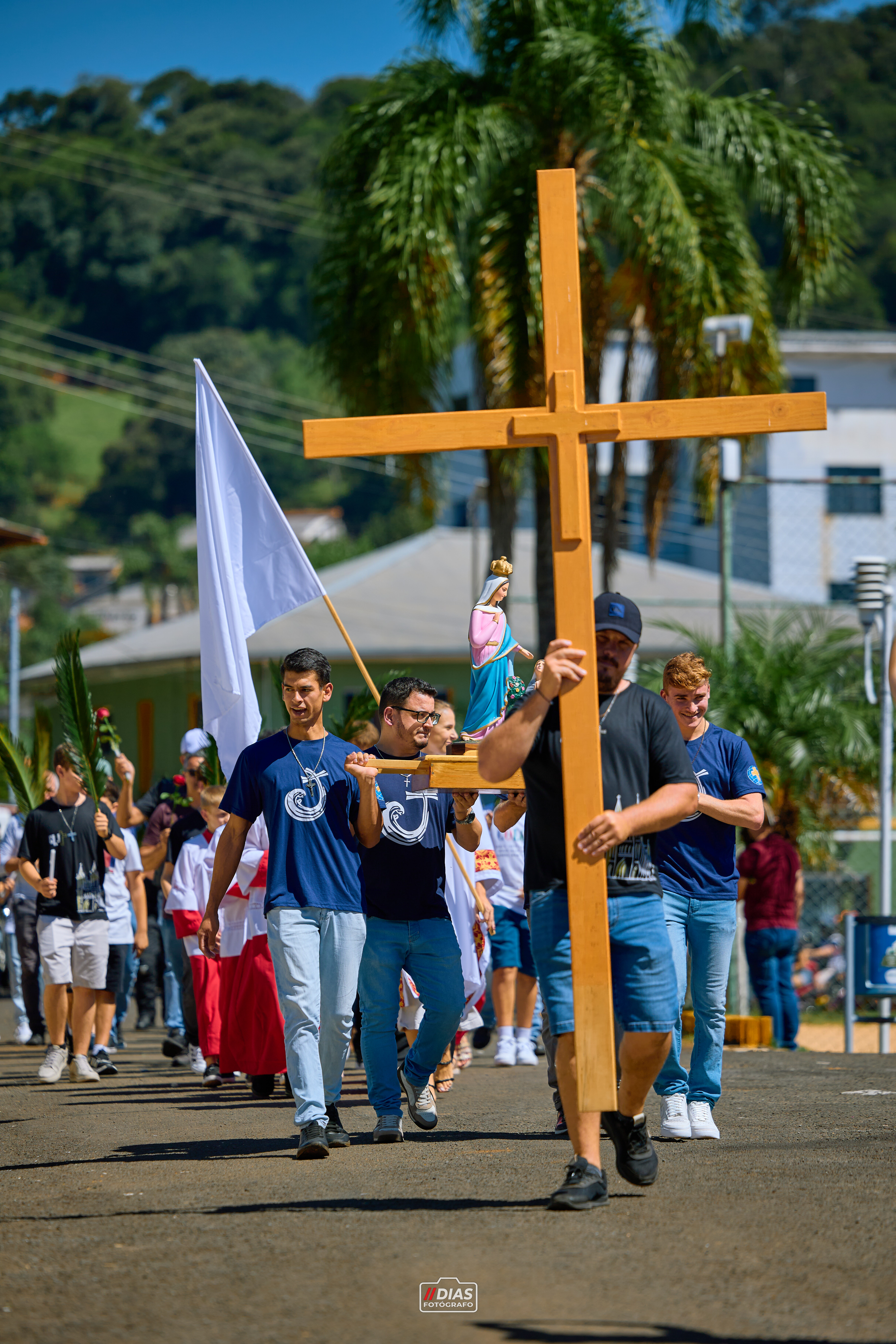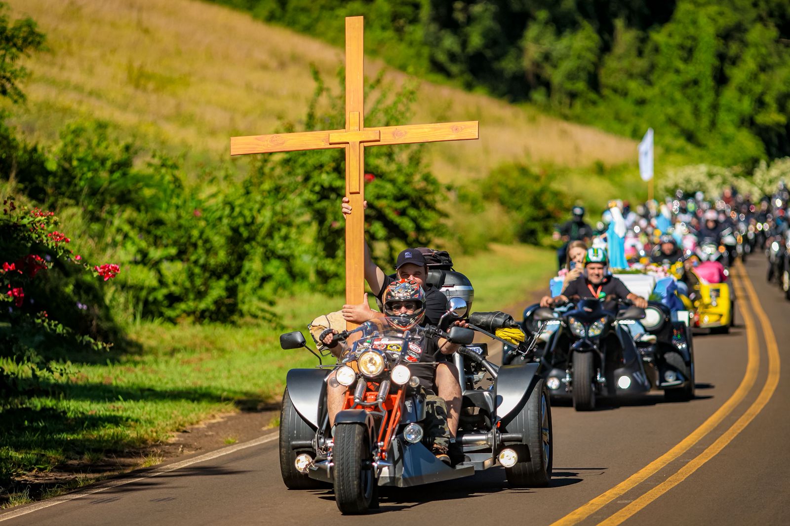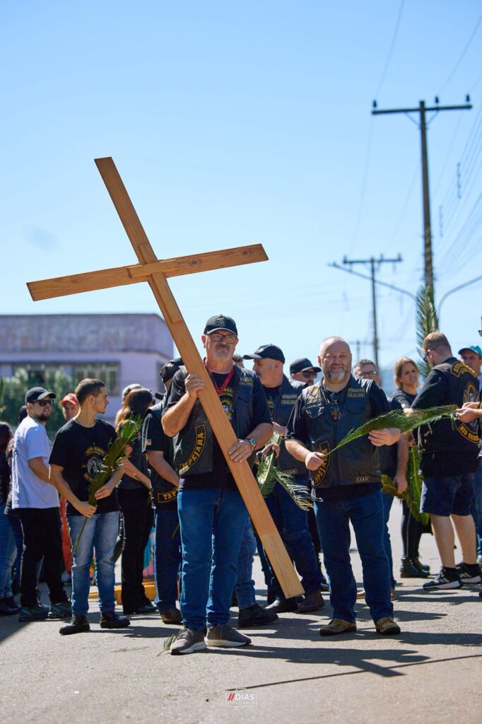 Às 10h, houve a chegada dos motociclistas, trazendo consigo a Cruz, a Bandeira da Paz e a Imagem de Nossa Senhora de Caravaggio. Devido a solenidade do Domingo de Ramos, que marcou o início da Semana Santa, foram distribuídos ramos a todos que se encontravam na esplanada do Santuário, a fim de que participassem da celebração que ocorreu, presidida pelo Reitor do Santuário, Padre Edio Bresolin.