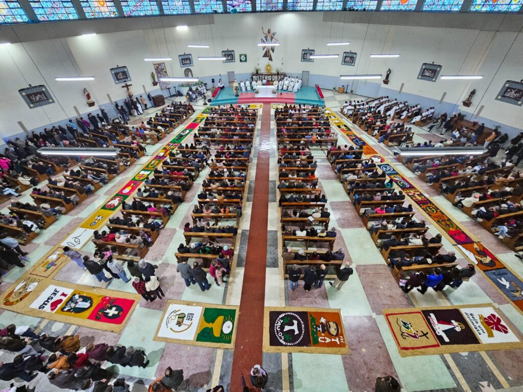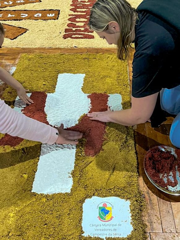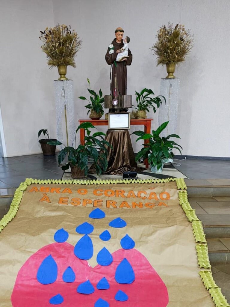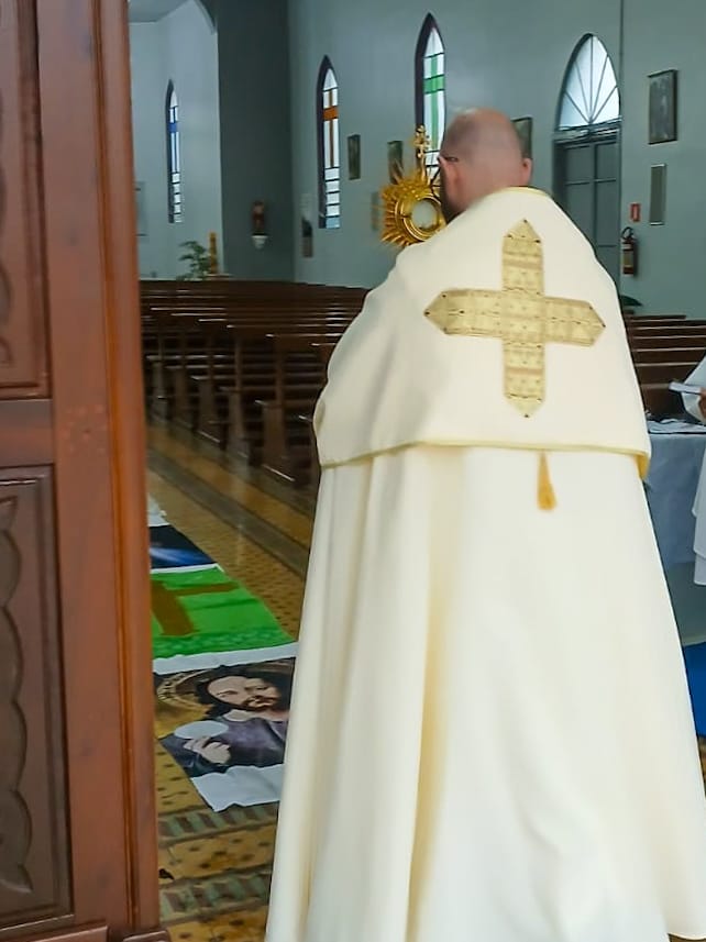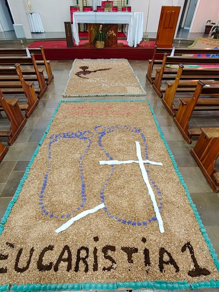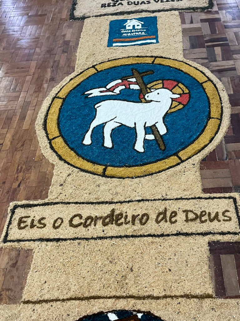 Em Lagoa Vermelha, a Paróquia Santo Antônio celebrou Corpus Christi com grande empenho. A comunidade começou a preparar os tapetes dias antes, com dedicação e criatividade. O tema deste ano, “Jubileu 2025 – Peregrinos da Esperança”, orientou a confecção, trazendo símbolos do caminho de fé e da presença viva da Eucaristia. Além disso, houve preocupação ambiental: muitos dos materiais foram reciclados, em sintonia com a Campanha da Fraternidade – Fraternidade e Ecologia Integral. Apesar da chuva ter impedido a procissão externa, a beleza e força espiritual permaneceram intactas, com o Santíssimo conduzido pelo frei Sérgio Dal Moro.