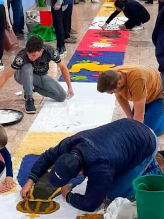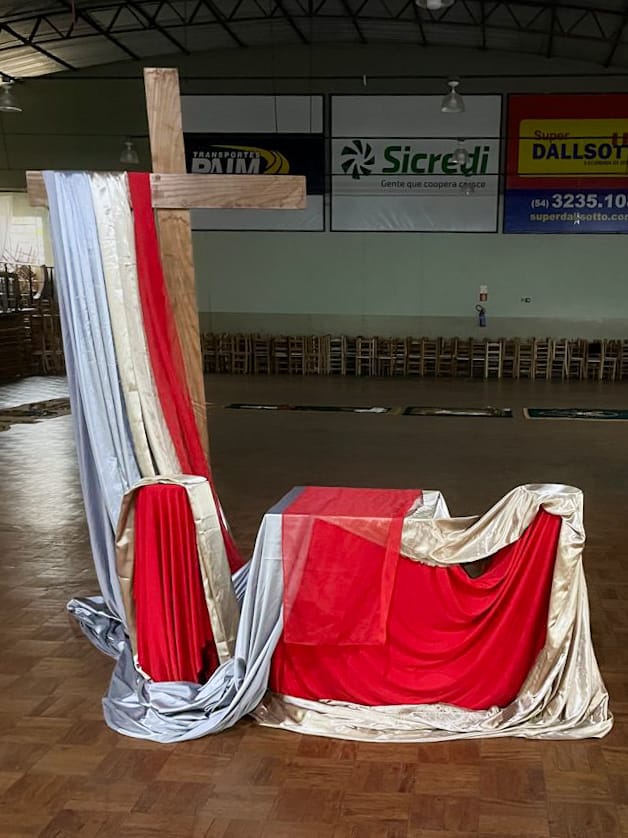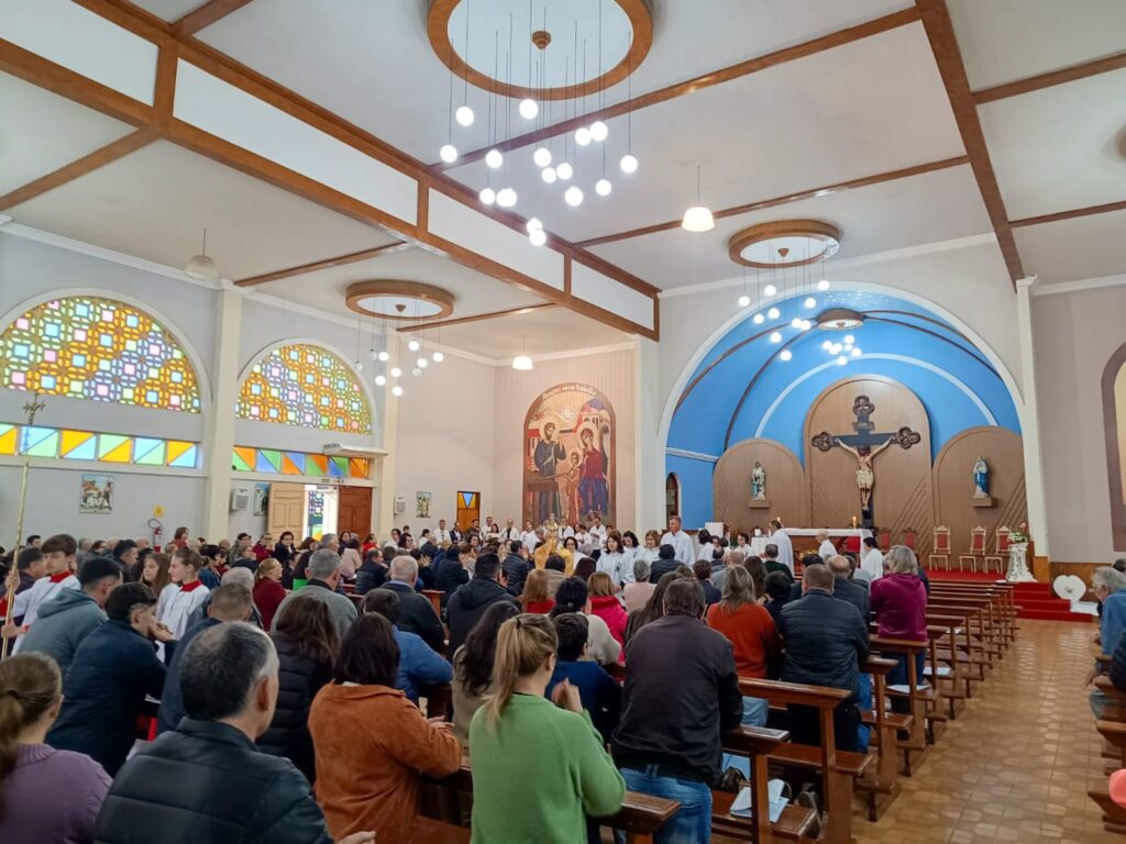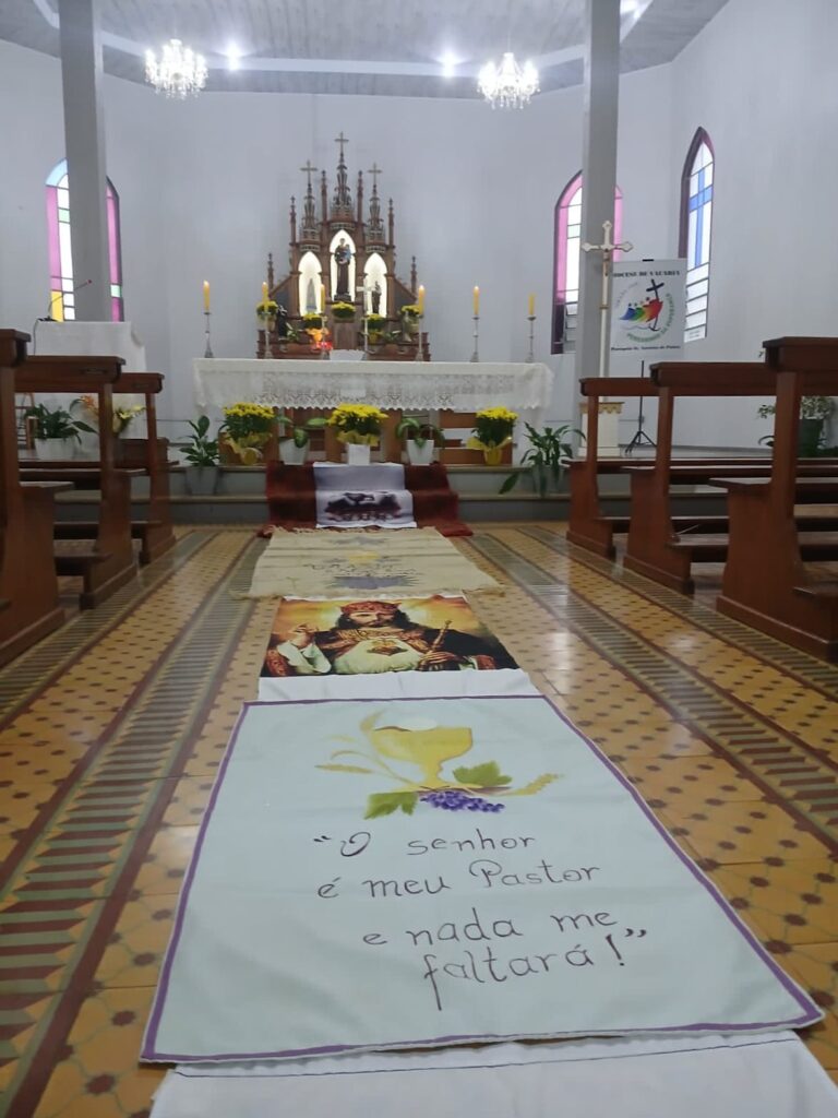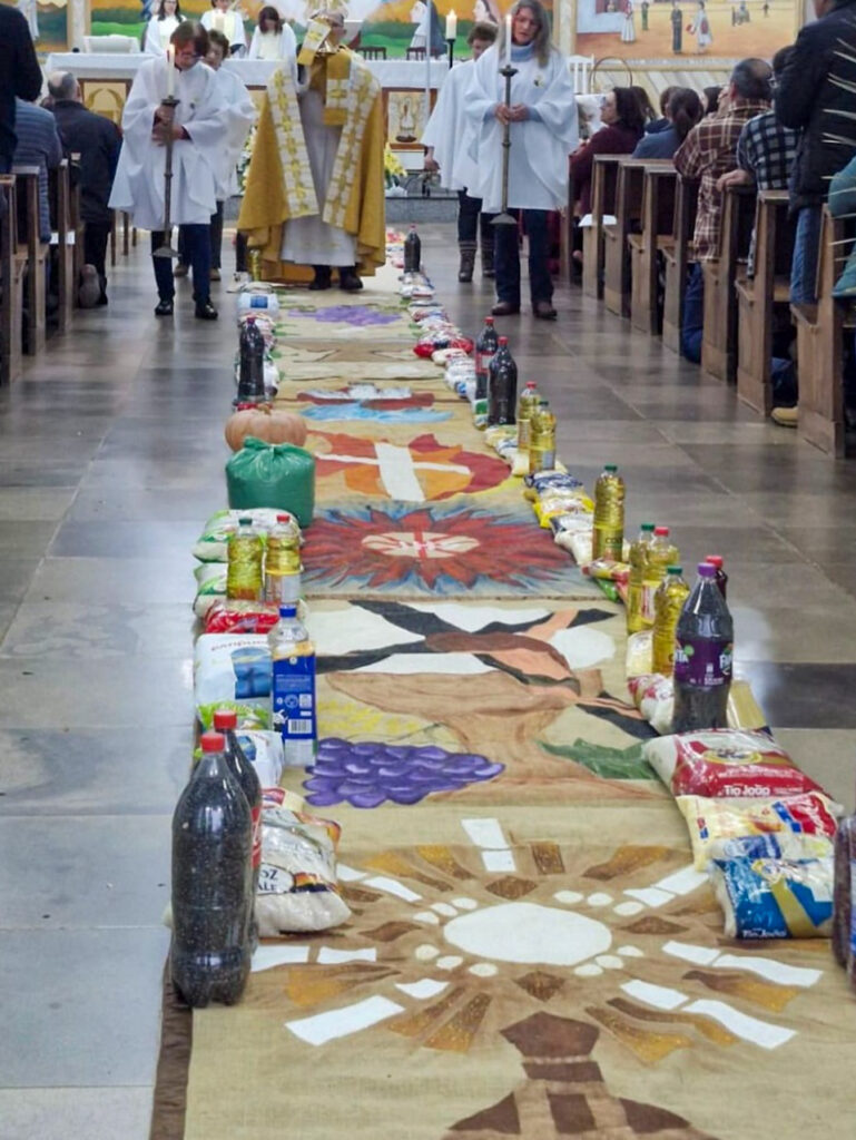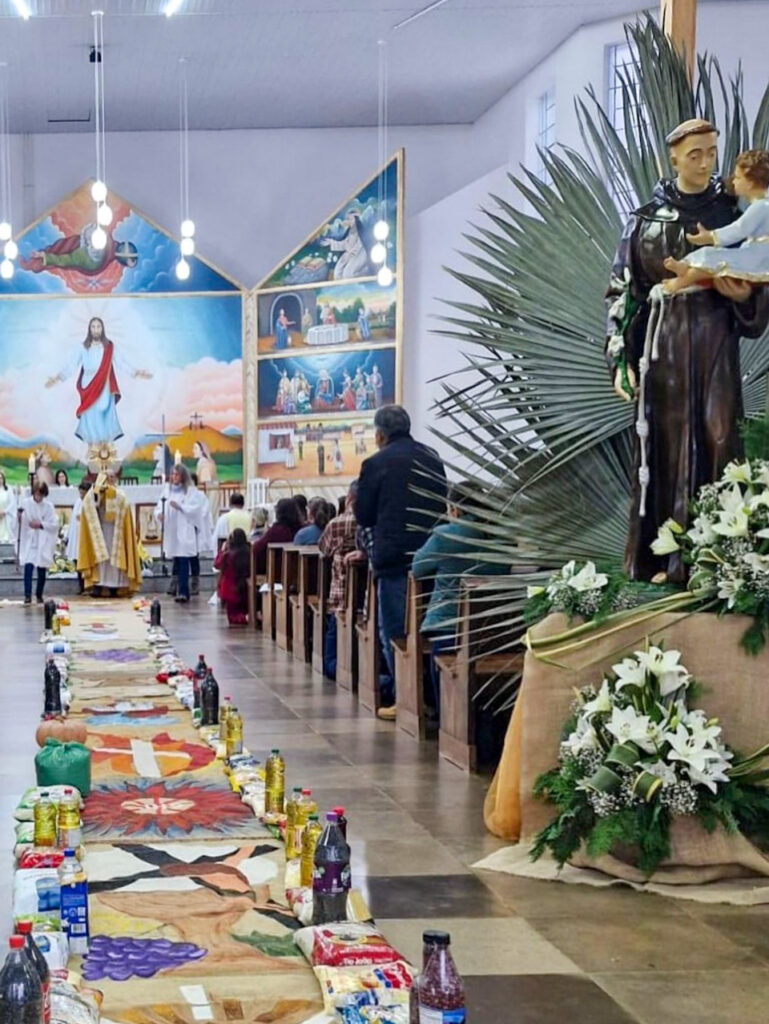 Em Cacique Doble, na Paróquia N. Sra. de Lourdes, a missa foi realizada na Igreja Matriz. Os tradicionais tapetes, que não puderam ser feitos na rua devido também ao mau tempo, foram confeccionados no salão paroquial. Movimentos e pastorais locais, juntamente com entidades civis como Bombeiros Voluntários, Lions Club, escolas, Trilheiros e grupos da Terceira Idade, se uniram para esse propósito. A comunidade também arrecadou 40 mantas, roupas para famílias carentes e cerca de 360 kg de alimentos, que serão destinados à Casa Fratelli Tutti, reforçando o espírito de solidariedade presente nessa celebração.